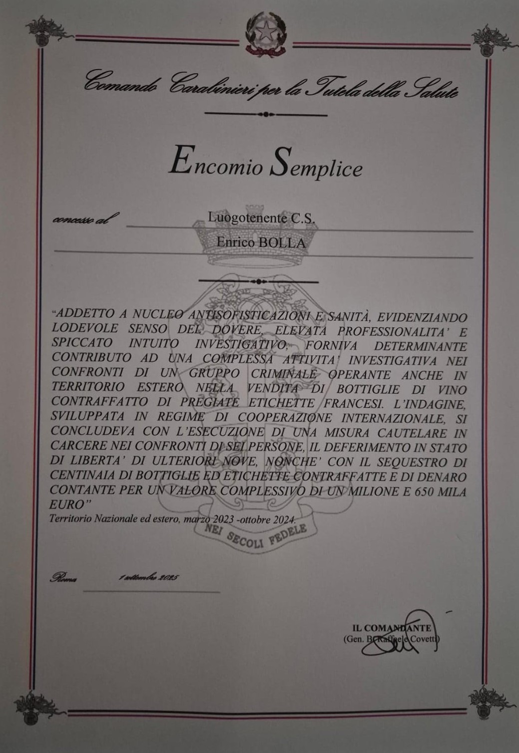Questa mattina, presso il Nucleo Antisofisticazioni e Sanità di Torino, alla presenza del Gen.B. Raffaele Covetti, Comandante del Comando Carabinieri per la Tutela della Salute, ha avuto luogo la cerimonia di consegna degli Encomi Semplici per i militari che si sono distinti in complessa attività investigativa nei confronti di un gruppo criminale internazionale specializzato nel campo della contraffazione enologica.